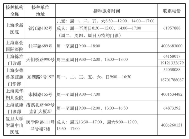 徐汇区各预防接种门诊服务信息详见表1和表2。